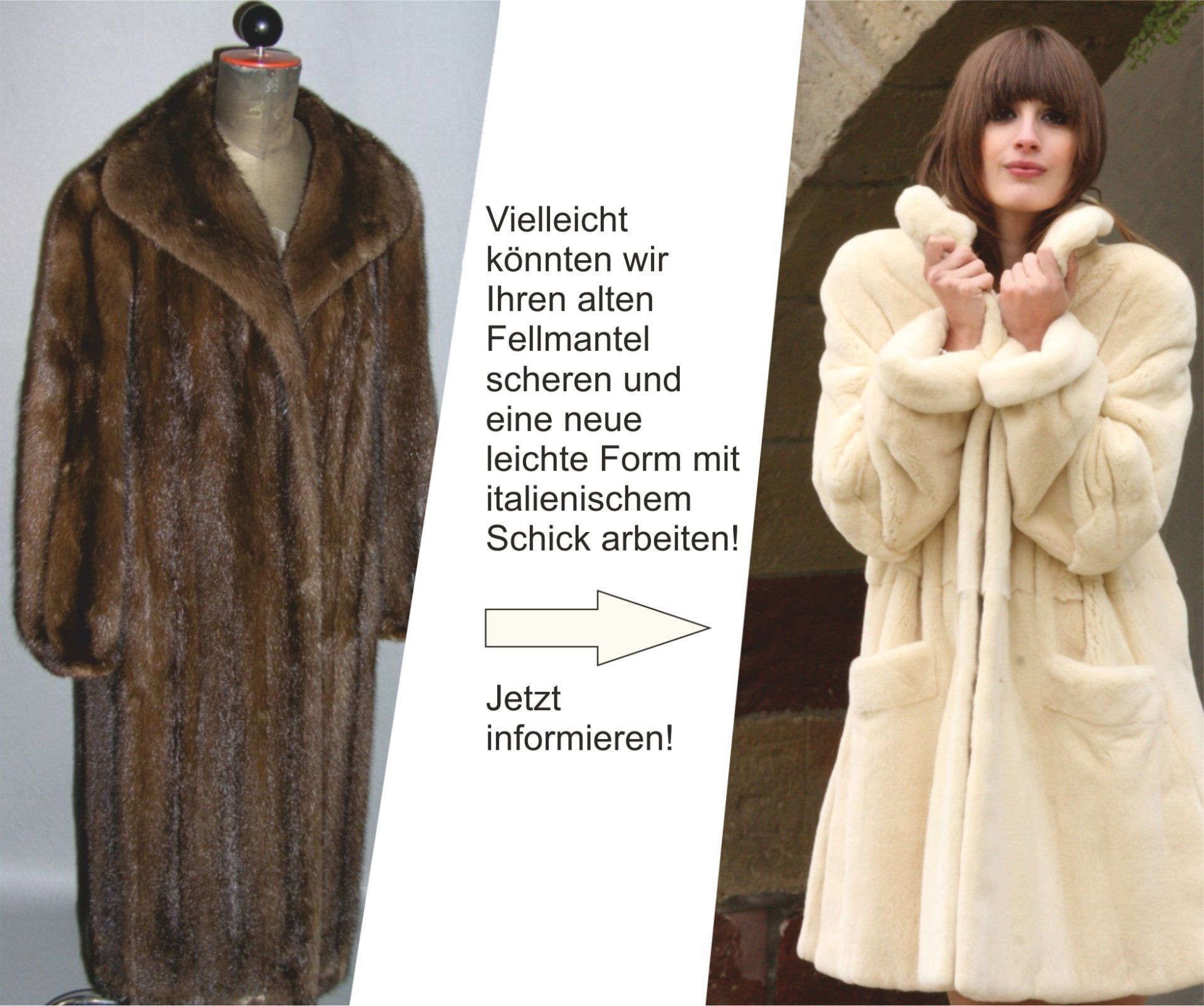 - Sie haben einen Pelzmantel geerbt oder ein älteres Modell im Schrank und Sie wollen es aufpeppen? Wir beraten Sie umfassend, entwerfen Vorschläge und erstellen unverbindliche, aber solide Angebote. So wird aus manch altmodischem Mantel ein trendiges Einzelstück.